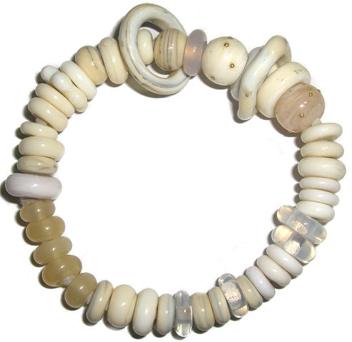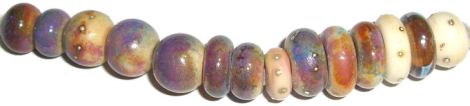 I’m starting to work on a few bracelets that I’m going to use brass in. I made some ivory/off white beads a while ago and needed some other beads with a little color in them. I decided to try some enamel powders. Little did I know that I would get an interesting reaction from the different colored enamels I used. It made the beads look more mottled. Me likes.