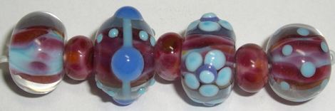 Then I played with more of The Mandrel’s frit. Still working with the Berry-licious one, I used it on a light turquoise base bead.