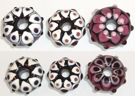 I’m trying to learn how to manipulate dots and do multi layer dots where they distort into different shapes. For me, this is not an easy task. My hand-eye coordination is sorely lacking so when it comes to precision, it’s tough for me. I know if I practice, I will get better. Here’s the first beads I made. I tried some simple techniques, like raking the dots towards the center. It looks better when there are more dots on top of dots but I didn’t want to spend an hour doing dots just to mess it up.