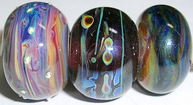 The picture is pretty crappy too. The left bead has a clear base with Terranova 2.1 over it. It’s not that colorful in person. The middle bead is a clear base encased thinly with Psyche. It didn’t look that good so I roughly lined on some of the new Bella Donna glass – Moody blue on top. The last bead is a clear base with Terranova and another glass that I can’t remember. It’s really dark and almost looks black.