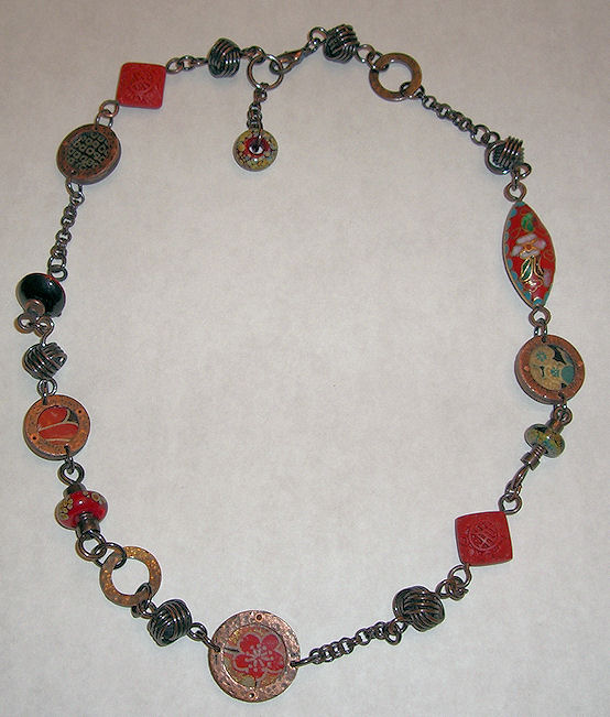 It’s mostly copper and I used washi paper for the pictures in the charms. It didn’t work out that well. I need to seal the paper before putting the other side on. Lesson learned. I used some of my own glass beads and some I bought eons ago. The metal knots are coils of wire that are interlocked together. They are called Danish knots.