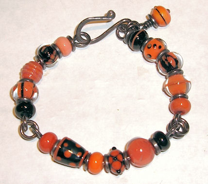 And still making tiny beads except not a pair of them. Just a random set of small beads. I made this bracelet out of some of them. I didn’t realize it would look so Halloween-y.