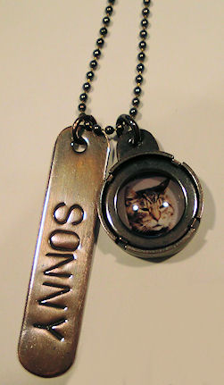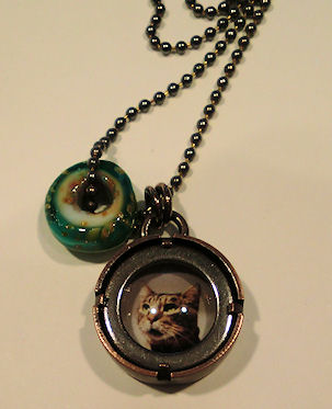 It’s a picture of my kitty, Marley. The picture is of the front and back of the pendant. It’s a little different than the ones my sister made. They have mica covering the picture and the whole thing is held together with wires threaded through the pendant.