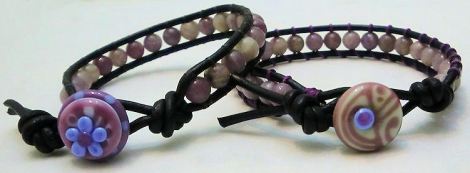 As you all know already, I don’t make just one of anything. So, here’s two more leather bracelets. I think these are some low grade charite gemstone beads. One of them I used Fireline to secure the beads in place and the other one I used C-Lon which ended up not being any easier. I could barely pass the thread through the beads and the thread is so wiry, it gets messed up easily.