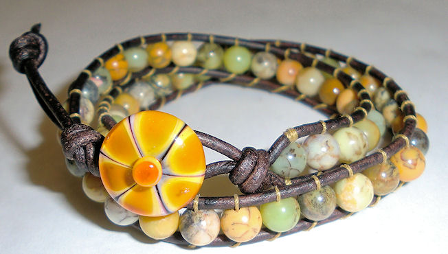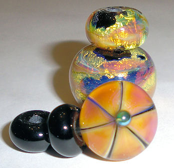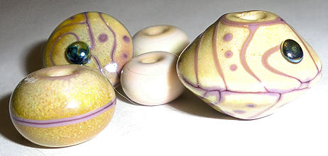 An opal yellow with raku frit and purple stringer work. I’m still trying to practice my stringer work each time I torch.