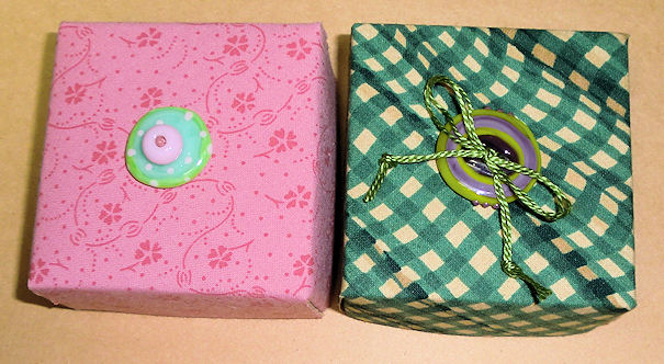 My mom made these fabric origami boxes. Of course it wouldn’t be right not to embellish them with a glass bead or button.