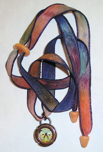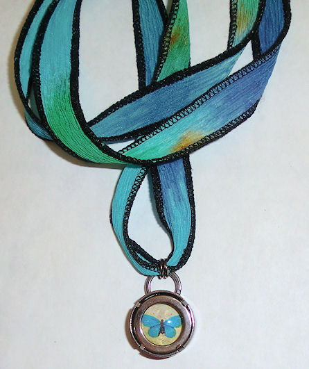 I used silk ribbons for the necklaces on the next three pendants. I finish them with a two hole glass button and glass end caps. The two hole button acts like a slider type clasp.