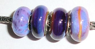 Left one is a blue base with purple frit on it. The middle two are silver glass. That’s the best I can do with the color. As you all know I’m silver glass challenged. The right one is an opal yellow base with enamels on it. I meandered a opal yellow stringer around the middle to add interest. I plan to make more blue and purple ones soon.