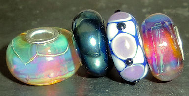 These also show the bad attempts at silver glass beads. The third on doesn’t have any silver glass in it, just got it cored. The other three are silver glass. Other bead makers so amazing things with silver glass, I’m happy is I get a decent color out of them.