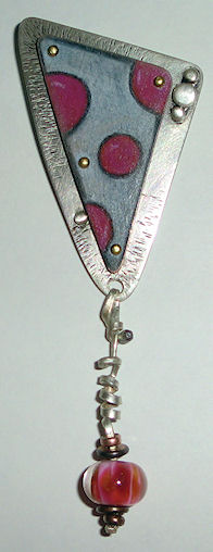 I finished another one. I really like the colored pencil piece but I did a bad job on the silver part and had lots of issues that I ran into. Mostly because I didn’t plan well. I’m not one to draw things out, I design as I go and it usually works out but in this case, not so much. One of the rivets got too close to the bail and I had a hard time hammering it without bending the tube bail. Then I used a dull drill bit on the bottom hole. It kind of mushed the silver around and left a rim. It’s hard to fix problems like these after I set the colored piece and sometimes working on it further just makes it worse.