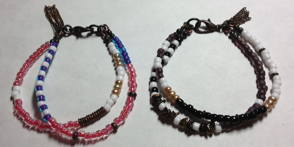 They are made out of glass seed beads and various copper beads and pearls. I added a chain tassel. Every project comes with it’s challenges. I usually buy the heaviest beading wire as it works the best with lampworked beads but it wouldn’t fit through pearl holes. Digging in my endless stash of stuff, I found an old roll of thinner beading wire. Yay!! Then I came to making the tassel. I’m using these old base metal copper plated necklaces and cutting them up. The chain is so fine that I’d have to use a very thin piece of copper wire to fit through the chain which wouldn’t be the best choice as it’s not hard enough to hold up to much abuse. Fortunately, the necklaces use a bigger ring the the clasp and there’s one on each end. It’s some kind of base metal and even though it’s thin it’s hard enough to be pulled on without bending the ring. Problem solved!! These are really fun as any combination of beads can be used.