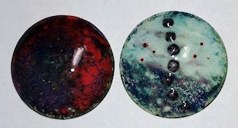 These are domed copper discs. The one on the left had some interesting texture in it before I put a layer of clear enamel on. I should have left the clear enamel off. Lesson learned. The right one, has little beads that I stuck on I used some pigment enamels to add some red dots. Probably could have added more.