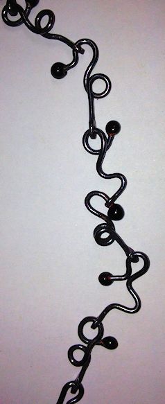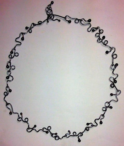This necklace was a test to see if I could make small glass balls on the end of wire. One end was balled up and then hammered flat and drilled to make a hole. The wires are linked together with a wire going through the holes, then the glass ball is added to the other side.