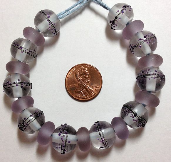 These are the first set I’ve made like this. Clear glass that has been etched with thin black lines and purple frit around the centers. The spacer beads are pale lilac and have been etched too.
