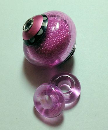 PinkPurpleMicrobeadsTwo different views. It’s cored with sterling silver tubing and the glass is veiled cane so it has striations in it.