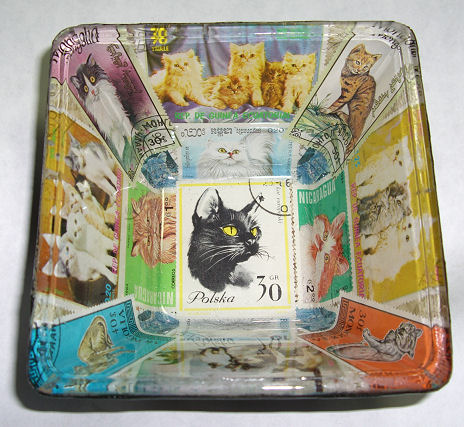 My friend uses real canceled stamps that she adheres to glass bowls and coasters. She knows I like cats so she gave me this one: