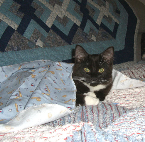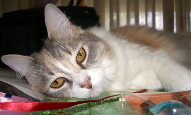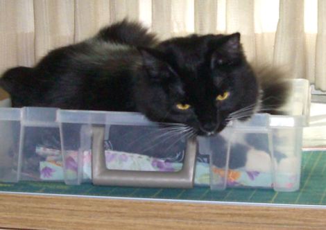 Igor likes to get in the way. Here he is in my mom’s quilt box.