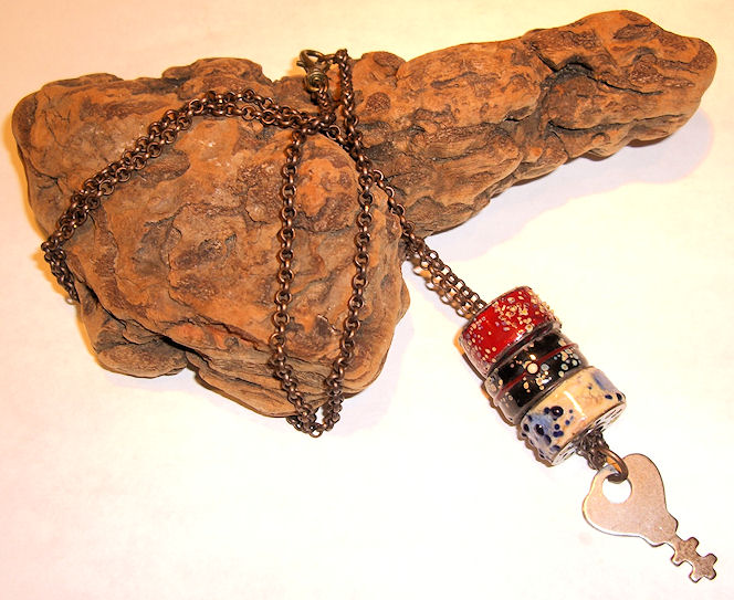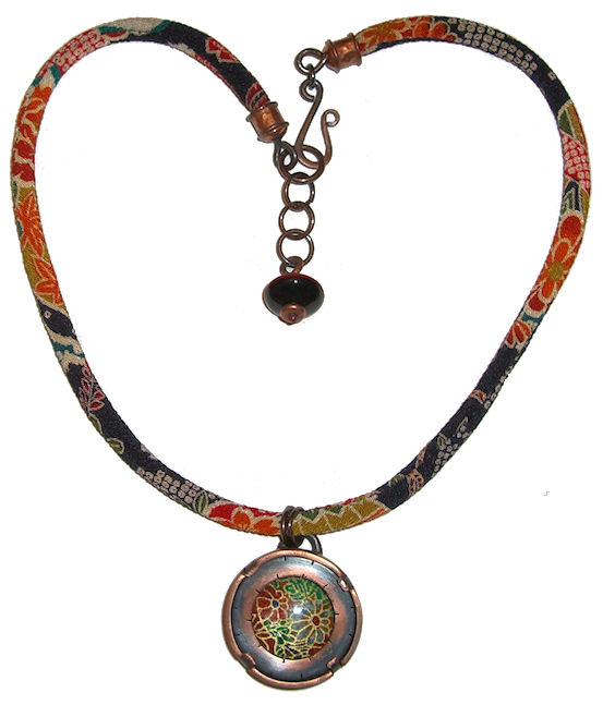 This piece was a test. First, it’s not solid copper. Not sure what’s in the middle but it was good enough to withstand the heat. I torch enameled this one using a layer of enamel, then I dipped it into glass frit – which is little chips of colored glass. This one went through an abuse test to see if there was any kind of incompatibility between the enamel and glass. I dropped it several times, stepped on it, and then banged the edges on concrete. The concrete did chip the enamel off the edges but I suspect any enameled piece would do the same thing. What I was looking for was a whole piece of enamel coming off and it didn’t. Yeah!!