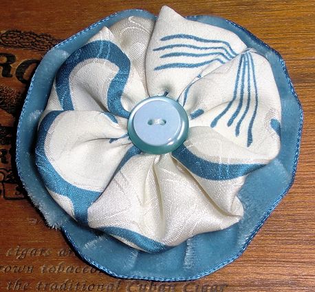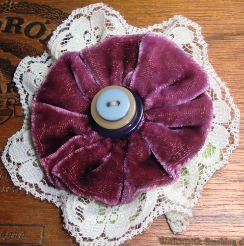 Here’s another flower pin I just finished. It’s got vintage velvet ribbon on the bottom and Japanese silk fabric on the top.