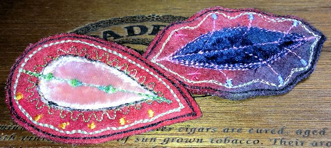 I was able to get started on making more pins. I’m still trying to learn how to operate my mom’s sewing machine. I swear it’s harder to learn than a new computer. These are hand dyed felt and hand dyed velvet with machine stitching and some hand embroidery.