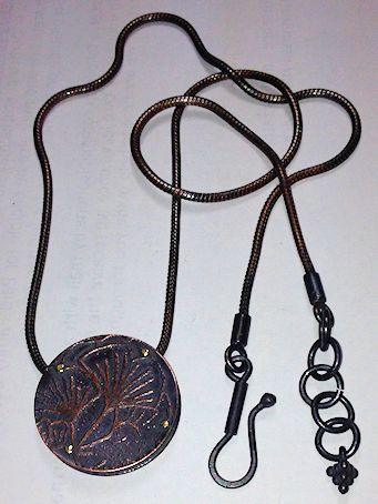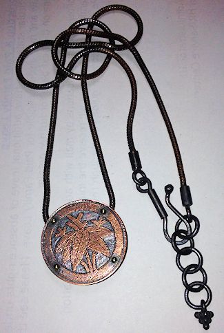 I etched these Japanese crests onto copper a few weeks ago. I riveted one to another piece of copper and ran a chain through the two pieces. I had to add the end caps to the chain after putting the pendant on as the end caps would not fit through the pendant. Here’s pictures of the front and back.